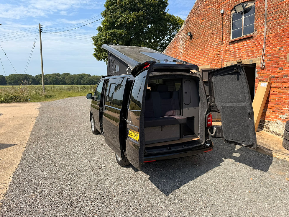 This black DSG Transporter is a perfect mix of modern performance and camper practicality. The sleek black finish gives it a premium, understated look, while the pop-top roof adds essential versatility with extra space for sleeping and standing. Inside, the conversion is fitted with high-quality materials and a carefully planned layout, featuring a fully equipped kitchen, integrated electrics, and smart storage solutions. With the smooth DSG automatic gearbox and our bespoke build, this van is as effortless to drive as it is to live in — making it an ideal choice for both everyday use and unforgettable adventures.