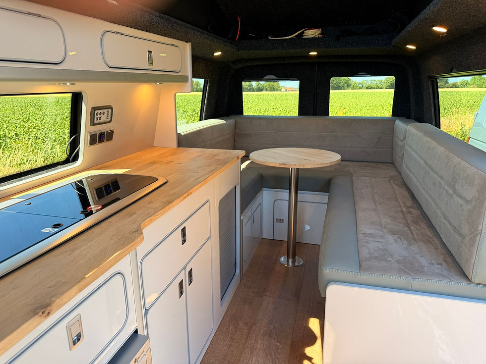 This bespoke two-tone camper, painted in-house, was a real head-turner and proved extremely popular at the show, selling almost instantly. The sleek exterior is matched by a thoughtfully designed interior, with a unique U-shaped seating and bed arrangement that maximises both space and comfort. Finished to a high spec with our signature attention to detail, this build is a perfect example of why our conversions stand out from the crowd.